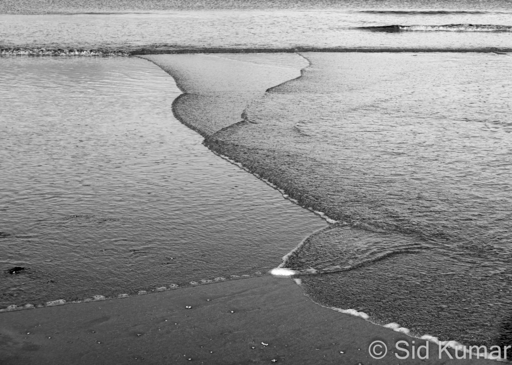 An unusual merging of waves from all directions created an interesting pattern. It was early morning and the angle of light helped with the contrast of the juxtaposition of incoming and receding waves.